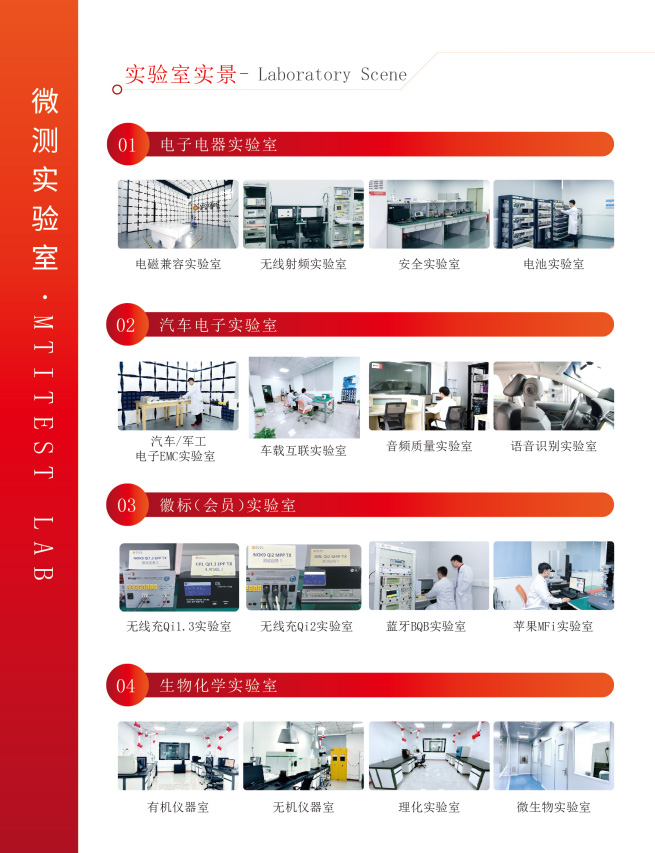 公司擁有20余個專業(yè)實驗室,128人的工程師團隊,10000㎡檢測科技園,獲得了CNAS、CMA、A2LA、CBTL、WPC、Bluetooth SIG等授權和認可。公司可為企業(yè)提供全球上百個國家的測試,包括華為HiCar、無線充Qi、藍牙BQB、蘋果MFi等眾多服務。無論企業(yè)身處何地,無論產(chǎn)品類型如何,微測檢測都能提供一站式解決方案,幫助企業(yè)順利進入全球市場。